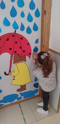 Lluvia simulada: Se colocan las gotas de lluvia con sedal en el patio de luz del hall del colegio con el fin de simular la lluvia cayendo.