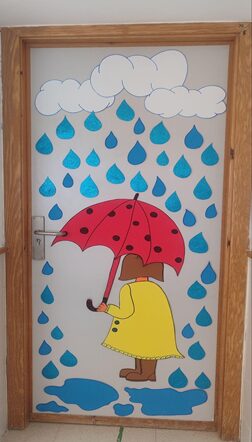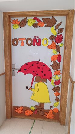 El alumnado decora la puerta del aula representando la estación del año en curso (otoño, invierno, primavera o verano) utilizando goma eva y otros materiales plásticos.