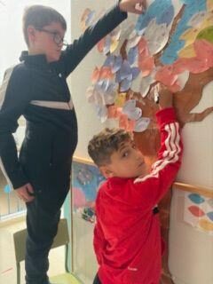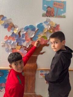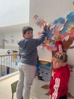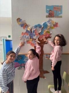 En un rincón del aula o en la entrada de la Biblioteca Escolar (BE), se coloca un gran mural con la silueta de un árbol desnudo. El árbol está dividido en cuatro grandes ramas o secciones que representan las cuatro estaciones del año.